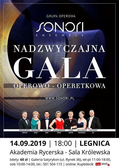 Gala Operowo-Operetkowa w wykonaniu znakomitych, utalentowanych artystów Grupy Operowej Sonori Ensembl to przebojowy koncert, podczas którego zabrzmią czardasze, walce, toasty, miłosne arie i duety, sceny operowe i operetkowe, a także standardy jazzowe, pieśni neapolitańskie i popularne piosenki. Przed Państwem niepowtarzalna podróż muzyczna, pełna emocji i wzruszeń. W programie najsłynniejsze sceny z oper: "Carmen", "Opowieści Hoffmanna", "Lakme", "Don Giovanni" i wiele innych, a także wiedeńskie przeboje operetkowe, jak "Księżniczka Czardasza", "Zemsta nietoperza" czy "Wesoła wdówka". Nie zabraknie także wirtuozowskich popisów pianistycznych oraz słowa wiążącego.