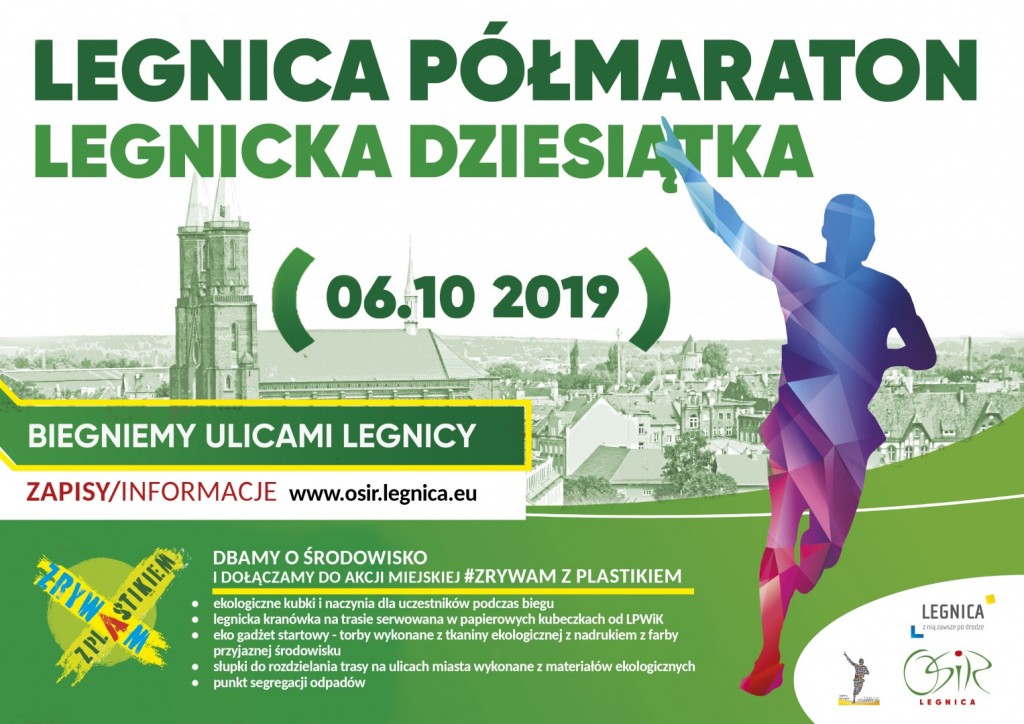 Bieg odbędzie się 06.10.2019 r. w Legnicy. Startujemy o godzinie 10:00. W tym roku pierwszy raz poruszymy Legnicę, ponieważ trasa biegu będzie wiodła w większości ulicami miasta Legnicy - „Biegowe zwiedzanie Legnicy”. Start PÓŁMARATONU I DZIESIĄTKI usytuowany będzie w centrum miasta ul. Wrocławska / plac Pastora Wolfganga Maxa Meisslera, a meta dla obu dystansów na boisku lekkoatletycznym w Parku Miejskim. ( trasa biegu: ul. Wrocławska, Żołnierzy II Armii Wojska Polskiego, al. Piłsudskiego (aż do ul. Sudeckiej), ul. Jordana, ul. Powstańców Śląskich, ul. Żeglarska, Park Miejski). Limit uczestników dla obu dystansów to 999 osób. Spikerem legnickiego święta biegowego będzie Jerzy Górski, triathlonowy mistrz świata w Double Ironman z Huntsville w Alabamie, bohater filmu „Najlepszy” w reżyserii Łukasza Palkowskiego.