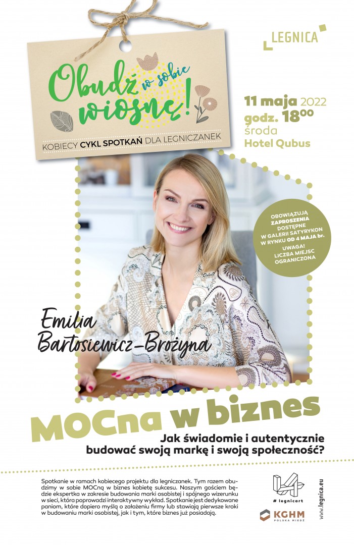 MOCna w biznes, czyli spotkanie z Emilią Bartosiewicz - Brożyną już 11 maja w Hotelu Qubus. Początek godz.18.00. To kolejne spotkanie w ramach cyklu "Obudź w sobie wiosnę", jakie Urząd Miasta w Legnicy organizuje tej wiosny dla mieszkanek.
