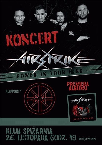 26 listopada - w klubie Spiżarnia odbędzie się koncertowa premiera "Power In Your Hand" - debiutanckiej płyty doskonale znanej z naszych imprez grupy Airstrike. Jako support zaprezentuje się zespół Destiny. Początek wydarzenia o godzinie 19 (otwarcie bramek o 18:30), bilety w cenie 20 złotych do nabycia przy wejściu.