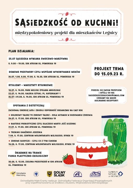 W trakcie spotkań: sąsiedzka wymiana owocowo-warzywna, wspólne wykonywanie przetworów, warsztaty rysunkowe, spotkania z dietetyczką, którą lepiej możecie poznać tutaj: Zmiany - Poradnictwo i Coaching Dietetyczny oraz piknik plastyczno-ekologiczny pt. Śniadanie na trawie. Chęć udziału w warsztatach zgłosić można pod adresem: sasiedzkoscodkuchni@gmail.com Inicjatywa odbywa się w ramach Programu Dolnośląskie Małe Granty, który realizuje Dolnośląska Federacja Organizacji Pozarządowych przy współfinansowaniu ze środków budżetu Województwa Dolnośląskiego.