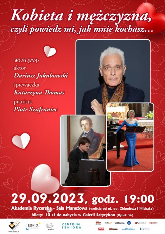 Kobieta i mężczyzna jest kolejnym przedsięwzięciem, z cyklu Spotkania. Tym razem Dariusz Jakubowski wraz z muzykami: śpiewaczką Katarzyną Thomas i pianistą Piotrem Szafrańcem, proponują lekką, poetycko-muzyczną podróż w poszukiwaniu spełnienia w miłości. Miłosne tematy w poezji od E. Dickinson, biblijnej, zmysłowej Pieśni nad Pieśniami, szekspirowskich Sonetów, po współczesnych Szymborską, Herberta, Gałczyńskiego czy Baczyńskiego.
