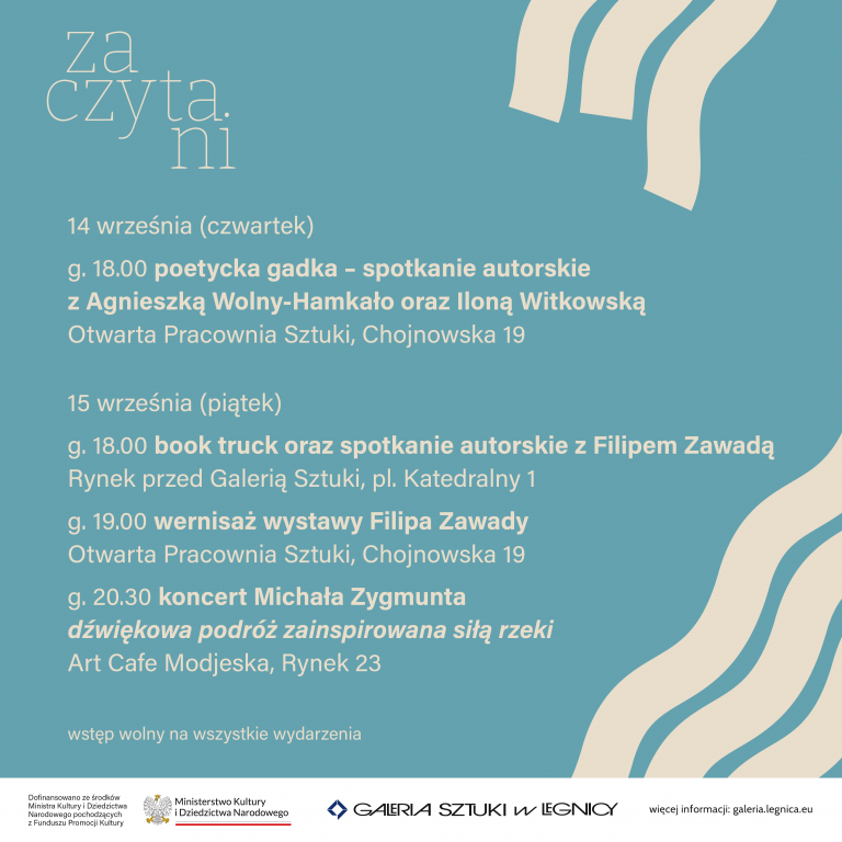Z kolei w piątek odwiedzi nas wrocławski Book Truck, czyli Mobilna Księgarnia Tajnych Kompletów – objazdowy dom kultury i zarazem obwoźna kameralna księgarnia ze starannie wyselekcjonowanym księgozbiorem. Spotkamy się także z Filipem Zawadą, pisarzem, muzykiem i kreatorem rysunkowej postaci Pana Ziemniaka, który z poczuciem humoru zastanawia się nad trudnymi pytaniami. Zwieńczeniem intensywnych wieczorów będzie koncert Michała Zygmunta, z którym popłyniemy nurtem dzikiej rzeki…