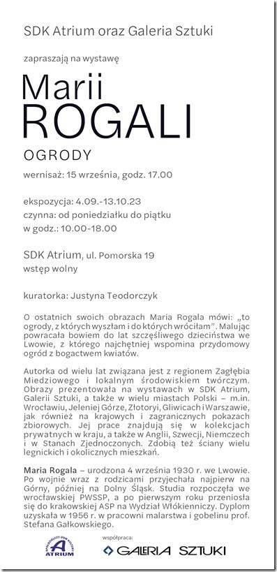 Serdecznie zapraszamy na wernisaż wystawy „Ogrody” Marii Rogali, który odbędzie się w piątek 15 września o godz. 17.00 w Spółdzielczym Domu Kultury „Atrium”.