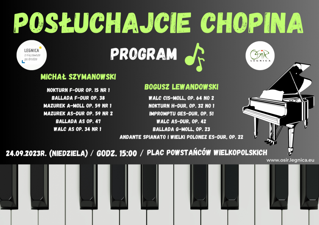 Ośrodek Sportu i Rekreacji w Legnicy zapraszają na koncert pianistyczny pn. "Posłuchajcie Chopina"