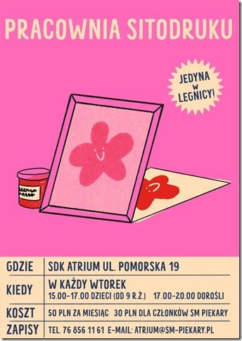 Zapraszamy do nowo powstałej, pierwszej w Legnicy, pracowni sitodruku. Jest to niebywała okazja, aby nauczyć się najpopularniejszej i najtrwalszej techniki druku, cenionej za szerokie możliwości artystyczne, jakie oferuje. Do popularyzacji sitodruku przyczynił się Andy Warhol – główny przedstawiciel pop-artu. Praktycznie każdy zna jego prace przedstawiające puszki zupy Campbell’a lub portret Marilyn Monroe. Technika ta polega na przeciskaniu farby przez matrycę, którą jest sito, na dowolną powierzchnię – m. in. kartony, tkaninę. W trakcie zajęć projektowane są i wykonywane nadruki na podstawie własnego wzoru. Pokazany jest cały proces powstawania dzieła – od przygotowywania sita, naświetlania, mieszania farb, aż po ręczny druk.