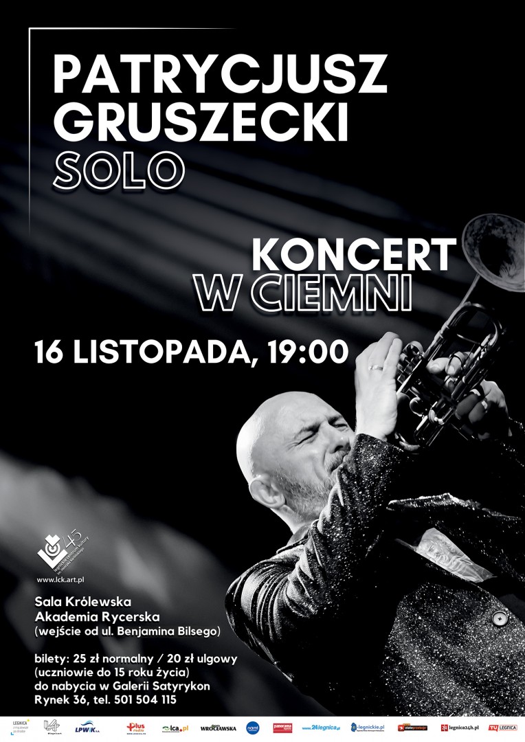 16 listopada w Sali Królewskiej Akademii Rycerskiej czeka nas wydarzenie, jakiego w Legnicy jeszcze nie było. Patrycjusz Gruszecki – trębacz znany chociażby z niedawnych występów ze swoim jazzowym trio na Legnica Jazz Day czy Legnickim Conversatorium Organowym – tym razem zaprezentuje się solowo z projektem „Koncert w ciemni”. Jak sama nazwa wskazuje, wydarzenie odbędzie się... w całkowitej ciemności. Będzie to okazja do całkowitego skupienia się na muzyce, rozwinięcia percepcji słuchowej i odbierania dźwięków całym ciałem. Początek koncertu o godzinie 19.00, bilety w cenie 25 zł (normalne) oraz 20 zł (ulgowe – uczniowie do 15 roku życia) dostępne są w Galerii Satyrykon. Wejście od ulicy Bilsego.