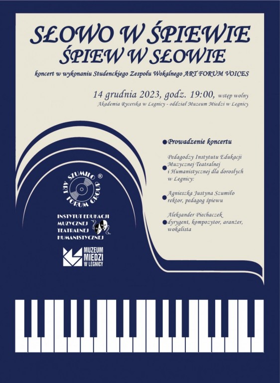 Serdecznie zapraszamy na koncert "SŁOWO W ŚPIEWIE - ŚPIEW W SŁOWIE" w wykonaniu Studenckiego Zespołu Wokalnego ART FORUM VOICES. W repertuarze znajdą się utwory klasyczne (polskie oraz zagraniczne) a także polski repertuar rozrywkowy. Zapraszamy w czwartek 14 grudnia o godzinie 19:00 - Akademia Rycerska w Legnicy - oddział Muzeum Miedzi. Wstęp bezpłatny.