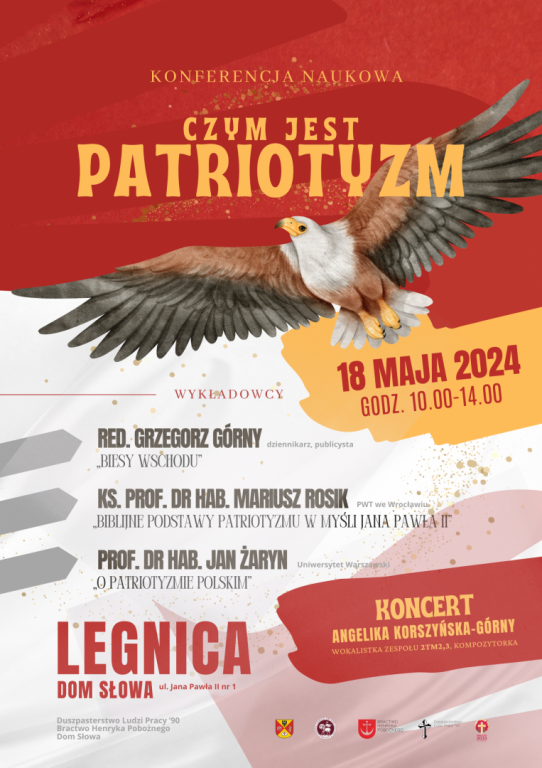 Konferencja Naukowa pt. „CZYM JEST PATRIOTYZM”, podczas której wygłoszą wykłady: ks. prof. dr hab. Mariusz Rosik (PWT) – „Biblijne podstawy patriotyzmu w myśli Jana Pawła II”; prof. dr hab. Jan Żaryn (UW) – „O patriotyzmie polskim”; red. Grzegorz Górny (dziennikarz, publicysta) – „Biesy Wschodu”, a zakończy ją koncert Angeliki Korszyńskiej-Górny (wokalistka zespołu 2Tm2,3, kompozytorka).