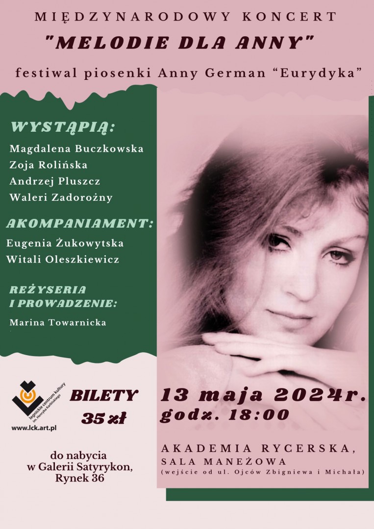 Więcej informacji o koncercie na stronie: https://www.lck.art.pl/aktualnosci/koncert-melodie-dla-anny-festiwal-piosenki-anny-german-eurydyka