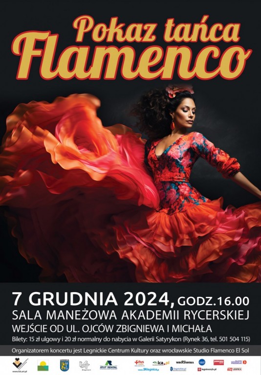 Zapraszamy w sobotę, 7 grudnia, do Sali Maneżowej Akademii Rycerskiej na popołudnie pełne tańca i muzyki hiszpańskiej. W trakcie pokazu swoje umiejętności zaprezentują tancerki z sekcji flamenco działającej przy Legnickim Centrum Kultury oraz – gościnnie – tancerki szkoły tańca Tierra Flamenca w Bolesławcu i Studia Flamenco El Sol we Wrocławiu. Początek o godzinie 16:00, bilety w cenie 15 złotych (ulgowe) i 20 złotych (normalne) do nabycia w Galerii Satyrykon. Wejście od ul. Ojców Zbigniewa i Michała.