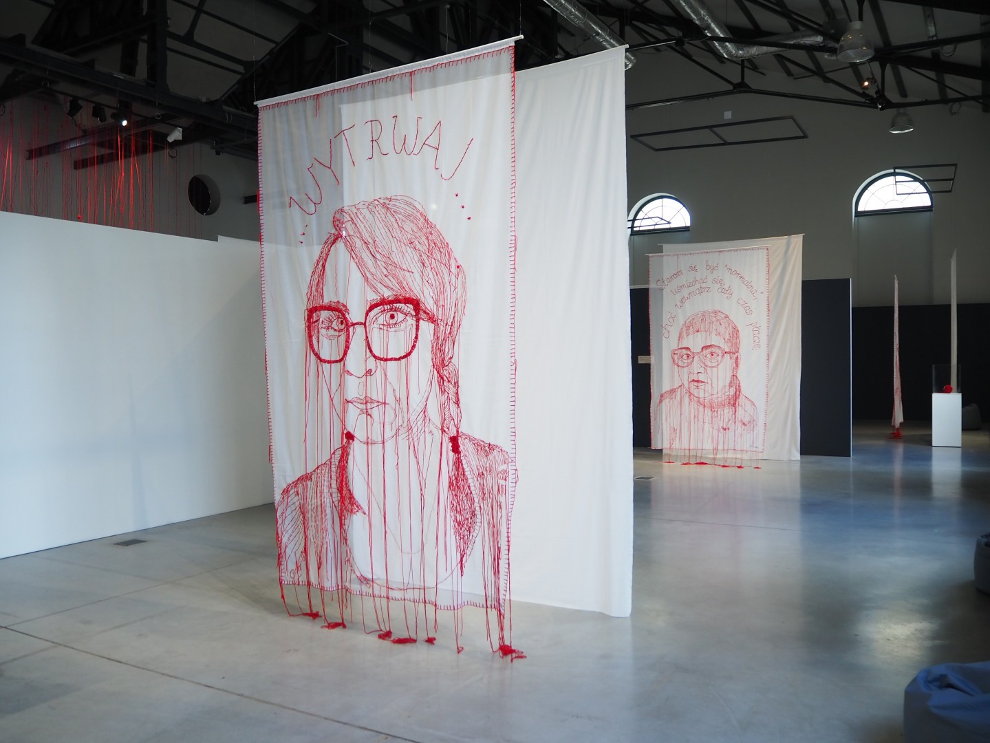 W skład wystawy wchodzą wielkoformatowe hafty, przedstawiające portrety bohaterek biorących udział w projekcie oraz nagrania rozmów prowadzonych przez artystkę Ewę Cieniak, pomysłodawczynię i autorkę projektu, z uczestniczkami wydarzenia. Ekspozycję dopełnia artystyczna instalacja wykonana z czerwonej włóczki, w której każdy sznurek symbolizuje osobę, doświadczającą depresji. W tle, spowity czerwonymi nićmi stoi „Stół z siedmioma nogami” – projekt zrealizowany przez artystkę w 2018 r. Stół, od którego wszystko się zaczęło, jest elementem układanki, prowodyrem projektu „Czerwona nitka”. Wystawy, która inspiruje do refleksji nad tematami zdrowia psychicznego, dąży do rozbudzenia świadomości widza.