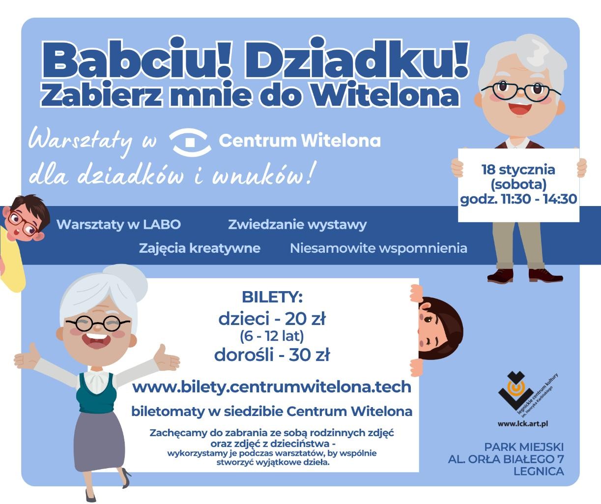 Zapraszamy dziadków do spędzenia niezapomnianego dnia ze swoimi wnukami (w wieku 6-12 lat) w Centrum Witelona! Czekają na Was warsztaty w LABO, zajęcia kreatywne, mnóstwo atrakcji i świetna okazja do wspólnego tworzenia wspomnień, które zostaną z Wami na długo. Dołączcie do nas i poczujcie magię rodzinnego czasu w wyjątkowym miejscu!