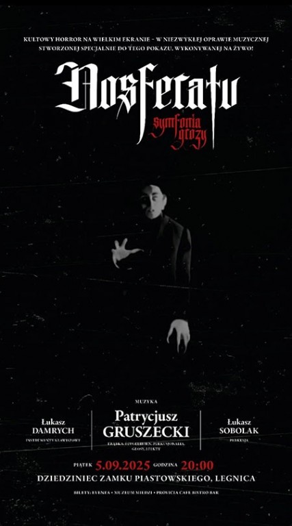 Koncert filmowy odbędzie się w piątek, 5 września o godz. 20. Bilety w cenie 70 zł są już dostępne stacjonarnie w kasie Muzeum Miedzi w Legnicy (gmach główny) oraz online https://app.evenea.pl/event/nosferatu-symfoniagrozy/