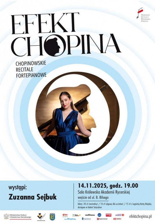 Opis: Narodowy Instytut Fryderyka Chopina i Legnickie Centrum Kultury zapraszają na kolejny koncert z cyklu „Efekt Chopina” prezentującego wybitnych młodych polskich pianistów – uczestników bieżącej oraz poprzednich edycji Międzynarodowego Konkursu Pianistycznego im. Fryderyka Chopina w Warszawie. Podczas recitalu w Sali Królewskiej Akademii Rycerskiej w piątek, 14 listopada o godzinie 19:00 wystąpi Zuzanna Sejbuk - jedyna Polka w tegorocznym Konkursie Chopinowskim!
